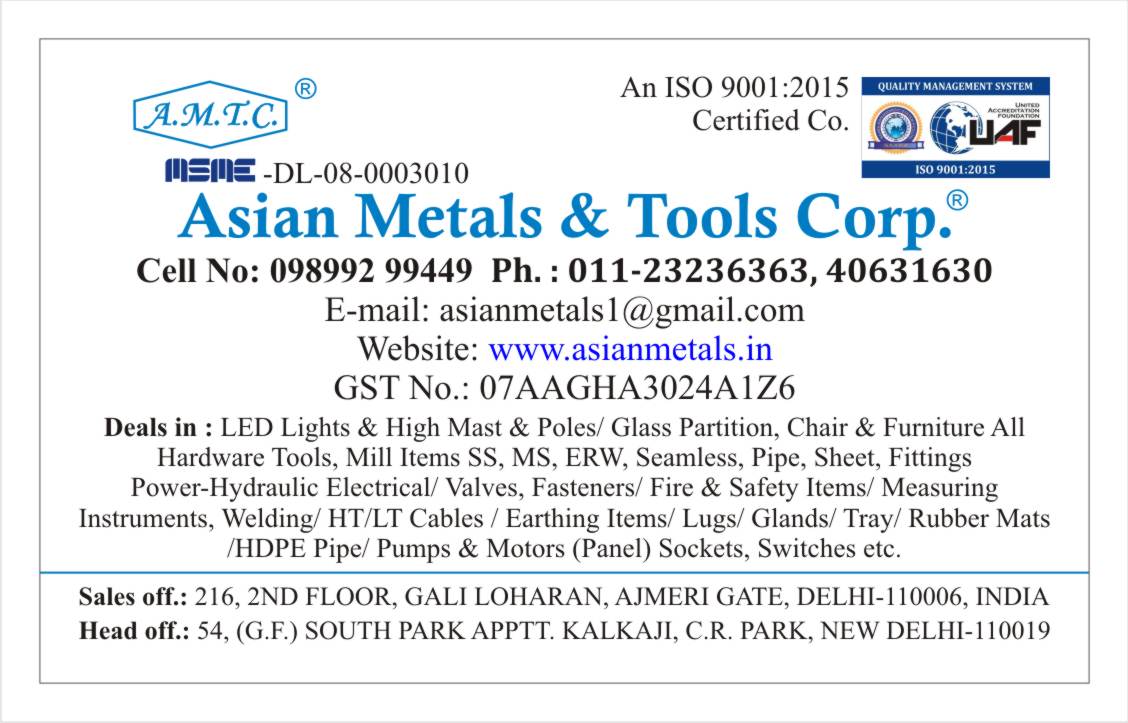 Authorised Dealer / Stockist / Importer /Exporter / Influencer of Products - Deals in All Type Metal, Pipe & Fittings, Values, Tools, Welding, Measuring, Mill, Fire, Safely Equipment, Paints, Fasteners, Nut & Bolts, Insulation Materials, Pump & Motors & All Electrical Items, Wires & Cables, Light Fittings & Lamps. Alloy Steel/Aluminium/Brass/Copper/Lead/Zink/Ferrous/Non-Ferrous, Metal in All Shapes, High Tensile Nut Bolts & All Type of Fasteners. Stainless SteelSheet, Plate, Round, Hex, Flat etc. Mild Steel Sheet, Plate, Beam, Channel, Angle etc. Pipe & Fittings - S.S. /M.S. /G.I. /C.S. /C.I. /PVC/HDPE. Tools-Workshop /Cutting /Power /Pneumatic. Pulling, Lifting & Hydraulic equipment. Industrial Values & Boiler Mountings. V. Belts, Rubber Hoses, Bearing etc. Mill Store, Asbestos insulation sheet / rope, Paints & Survey Instruments. SS/MS/High Tensile Fasteners. Rubber / PVC / HDPE Products. Fire Fighting Equipment, Chairs, Furniture and RED PLUS (Kubik ) Partitions.